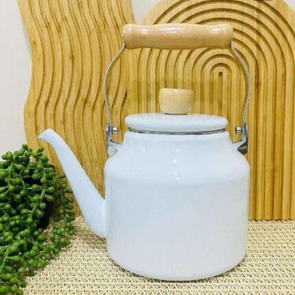 غلاية شاي بيضاء بتصميم عصري ومقبض خشبي