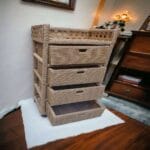• Materials: Drawers made from woven material, likely wicker or similar natural fibers, giving it a natural and rustic appearance.